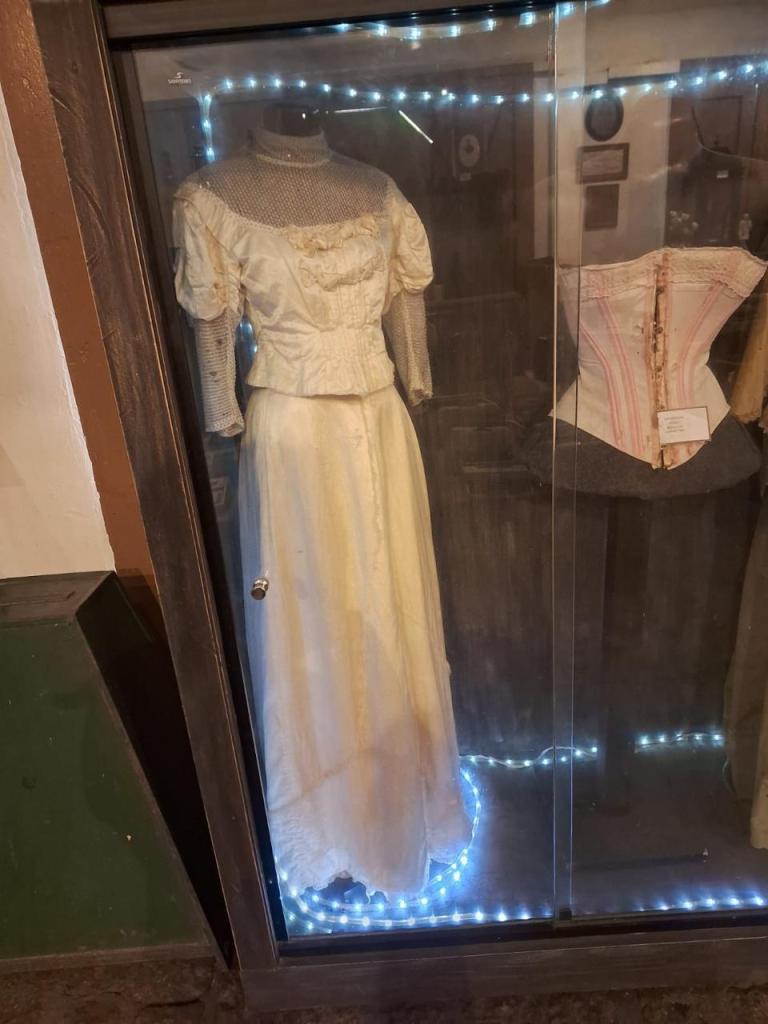 A semana passada, estive finalmente na “Casa da Cultura” (antiga Estação Ferroviária) de Bezerros, para ver os dois vestidos de noiva dessa minha bisavó Emília. Infelizmente, pela inaptidão da fotógrafa, e pelo empecilho da vitrine onde estão expostos os vestidos naquele museu, a foto que segue com esta crônica não é fidedigna às cores e à beleza dos vestidos branco e verde.